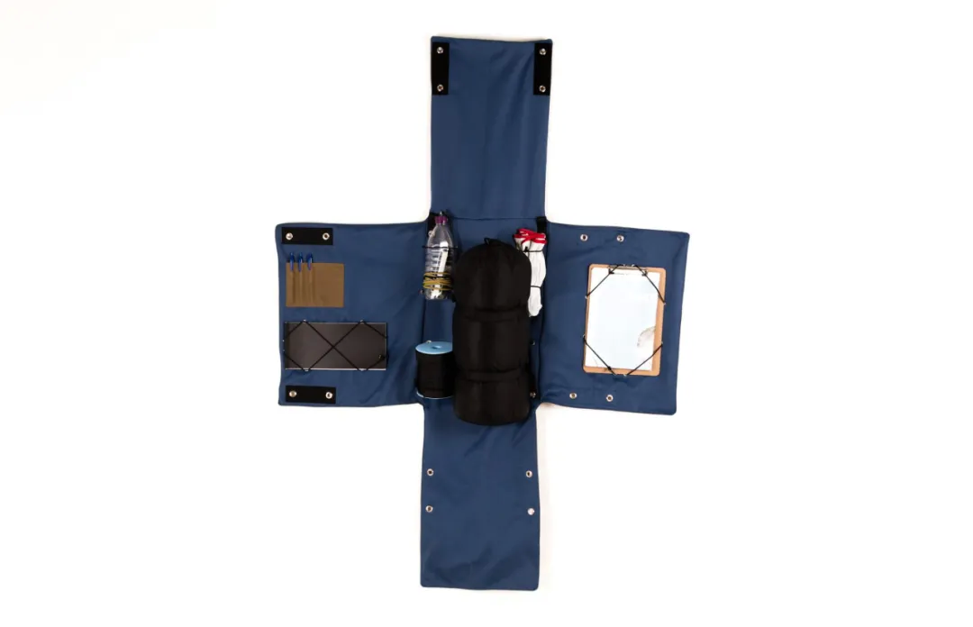 Aerocene Backpack 2006-ongoingDeveloped by the Aerocene Foundation and community. Courtesy the artist and Aerocene. Photography by Studio Tomás Saraceno. The Aerocene Explorer Backpack is licensed under the open source Creative Commons CC BY-SA 4.0 license.Aerocene背包是一个便携的飘浮的启动器装置,包括一个太阳能航雕塑装置和一个对应的感应装置。它无需使用化石燃料、氦气、氢气、太阳能电池板或者电池就能飘浮起来。仅靠太阳的热量,它就能升起几个能够捕捉到例如天气、湿度、压力以及空气质量的气候数据的感应器。它是一个完全开放的资源,它的使用者被邀请来适应并改进其功能,从而提倡Aerocene社群的DIT(Do-it-Together)精神。