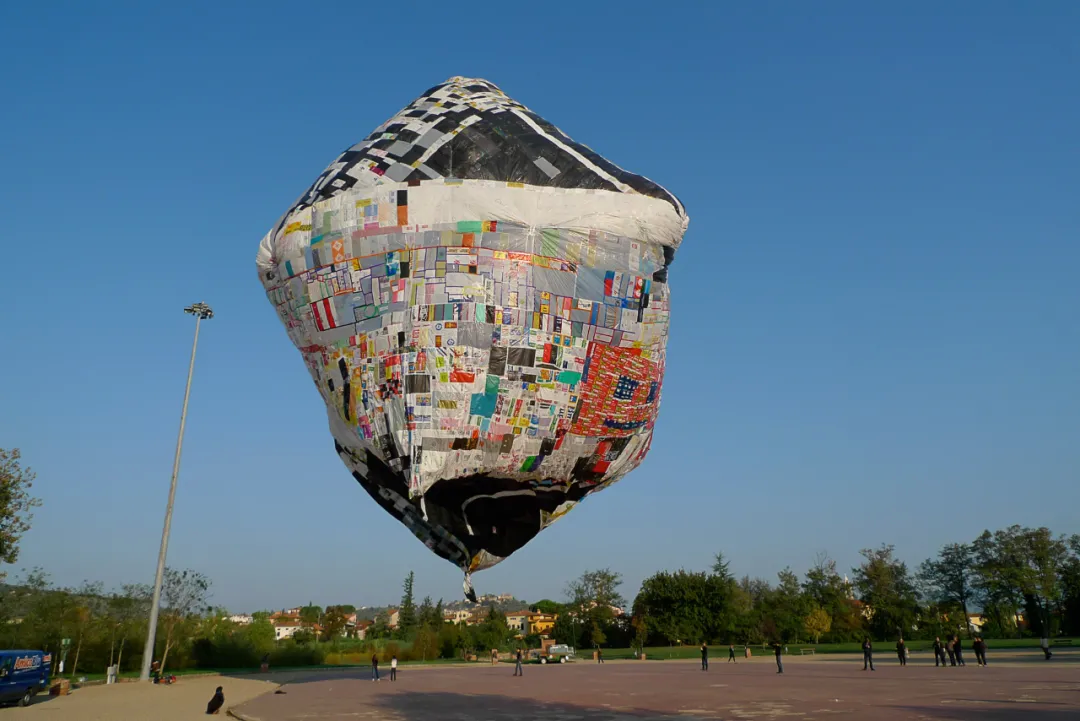 Museo Aero Solar, 2007–ongoing At Prato, Italy, in 2009 with Alberto Pesavento, Tomás Saraceno, Janis Elko, Till Hergenhahn, Giovanni Giaretta, Marco, Alessandro, Manuel Scano, Michela Sacchetto, and Matteo Mascheroni.Courtesy Museo Aero Solar and Aerocene Foundation. Photography by Janis Elko.Licensed under CC BY-SA 4.0.2007年,由托马斯·萨拉切诺和Alberto Pesavento的对话所启发,Museo Aero Solar是由人类和非人类的参与所形成的。这个太阳能气球完全由塑料袋的重新利用和参与者的合作,集体制作出一个仅用太阳创造的动能就能在大气中不断移动的太阳能航塑料装置。Aerocene背包