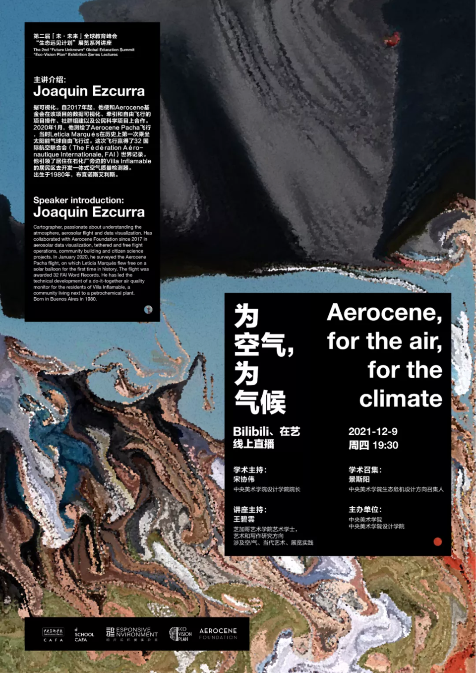 《后碳未来:为空气设计》本课题是中央美术学院设计学院生态危机设计二年级专业课程,是为了了解和探索我们如何用艺术与设计的媒介处理空气与场域。生态危机不能只用视觉的方式进行分析,在系统里和大气中的内容是肉眼看不到的。“通过‘空气’思考”成为关联和分析我们周围世界的隐喻和方法。用布鲁诺·拉图尔的话来说,这门课程的目的是“将空气作为一种事实” ( “To take air as a matter of fact” )。随着全球气候变暖/变异(global weirding) 现象加剧,我们遇到极端天气变得越来越普遍。我们控制气候的短期方式创造了对“空调式”生活的期望——不太冷,不太热,但“恰到好处”。但这种舒适程度在气象层面和情动(affect)层面说明了什么? 了解空气如何在艺术中呈现,以及如何在设计中处理,就是了解这个基本元素如何在文化中被操纵。课程会分析以空气为媒介的艺术作品和设计项目,同时涵盖大气如何作为政治和情动实体存在。线上:http://live.bilibili.com/22639762